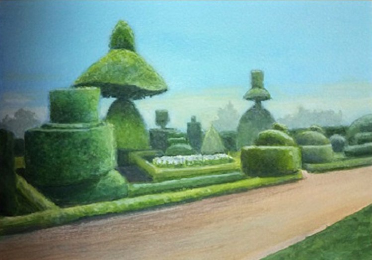 | Feedback from members: Barbara Stevens: I think it needs something, but not sure what. Maybe some crows?! Maybe a person with the shape of their clothes echoing that of the topiary? Dave Tribe: I love it – but maybe a couple of Corona Viri rolling up the path would satisfy Barbara! Gina Grimwood: I too like this painting but agree that the path is a bit long & empty. Maybe if the light was coming from the left the topiaries would have cast some interesting shadows on the path? |